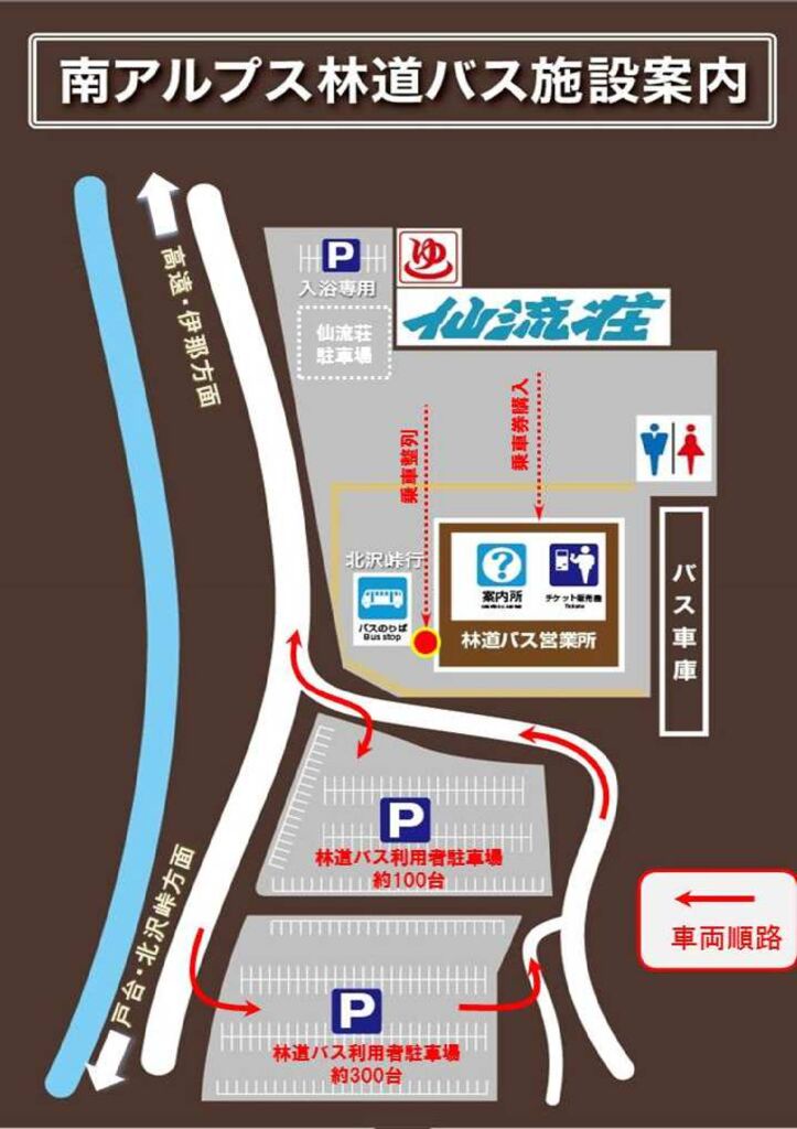 隣の戸台パークに駐車されている方は、ザックなど荷物を車に置いたら、仙流荘前の駐車場に車を停めて利用すると便利です。
